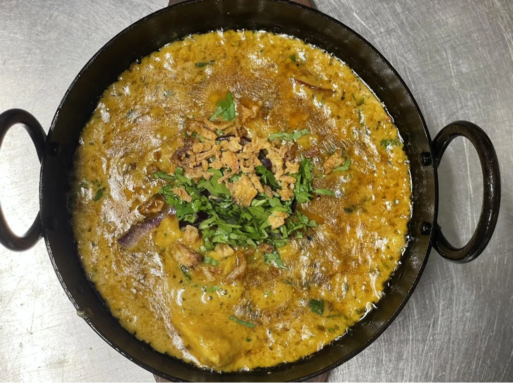 Kokt lamm tillagas i baltisås, toppad med färsk koriander, rödlök och serveras i het järngryta